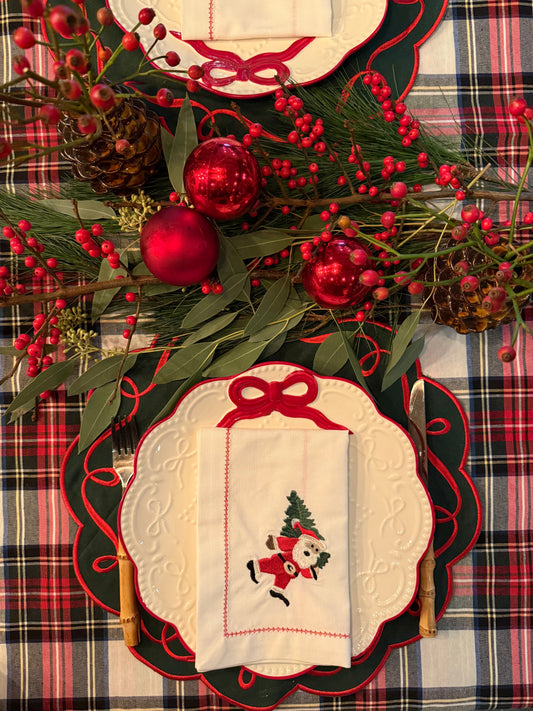 Katoenen servetten (2 stuks) wit met diep groene strikken en golvende rand