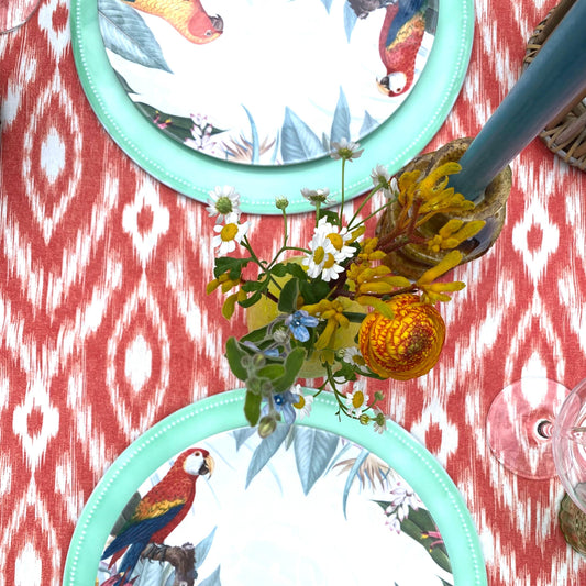 Waterafstotend tafelkleed ikat blauw met gele en rode streep