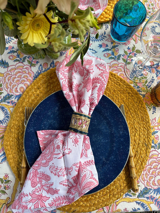 Cotton napkins block print white with pink flowers