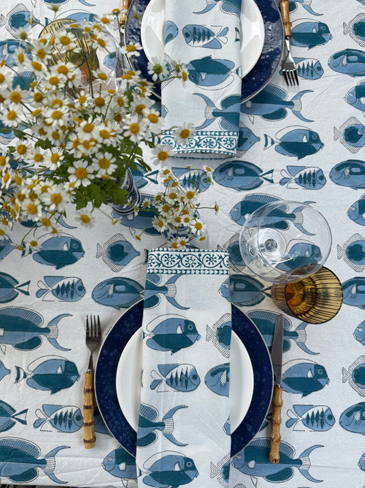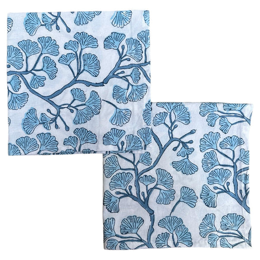 Tablecloth Indian block print light blue with white ginkgo leaf motifs