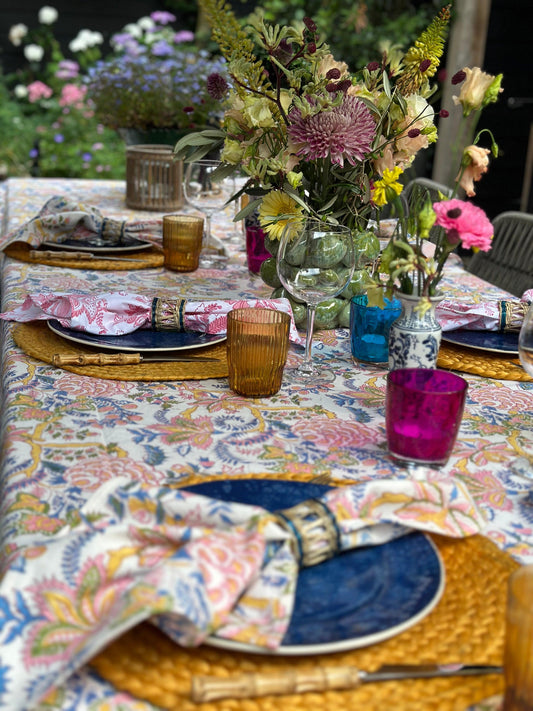 Tafelkleed Indiase blockprint geel met roze, blauwe en groene bloemen