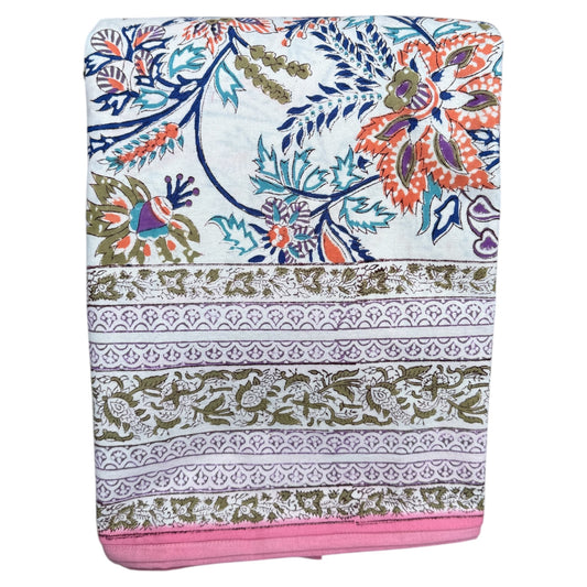 Tablecloth Indian block print white with burgundy red, lavender blue and pink flowers