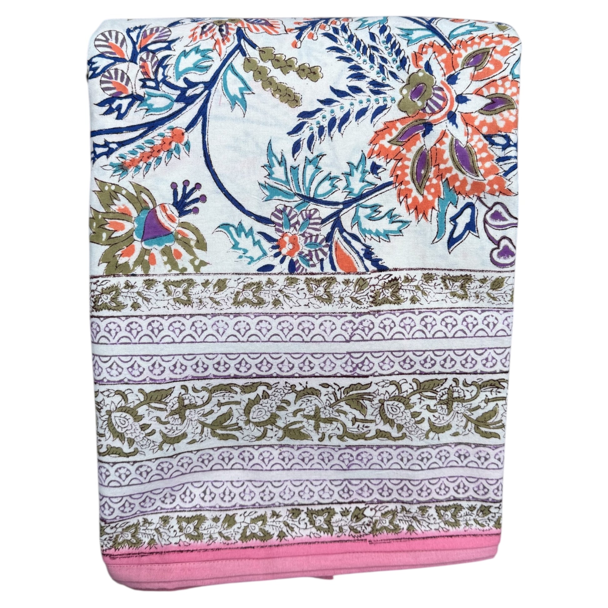 Breng kleur en karakter aan je tafel met dit prachtige handgedrukte tafelkleed uit India. Elk kleed is met de hand vervaardigd volgens de traditionele blockprint-techniek, waarbij houten stempels worden gebruikt om het unieke bloemmotief laag voor laag aan te brengen.