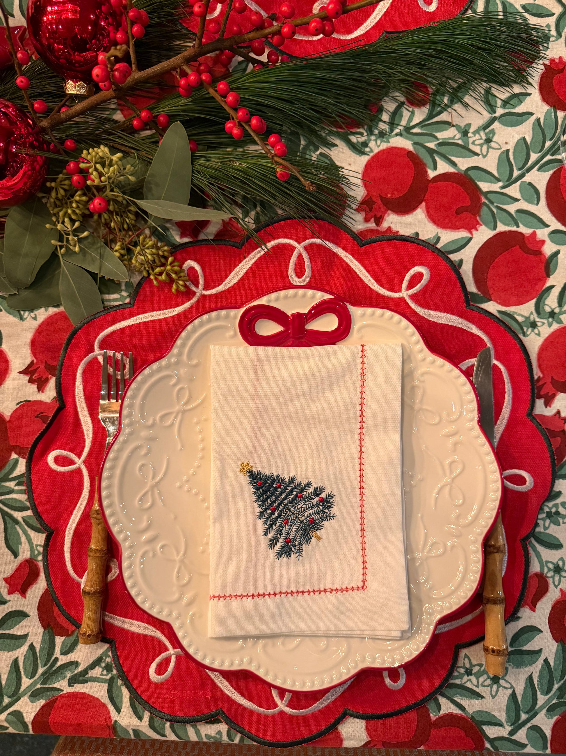 Een wit katoenen servet met een verfijnd geborduurde kerstboom en een rode stiknaad is een perfecte keuze voor een feestelijke en vrolijke tafelsetting.