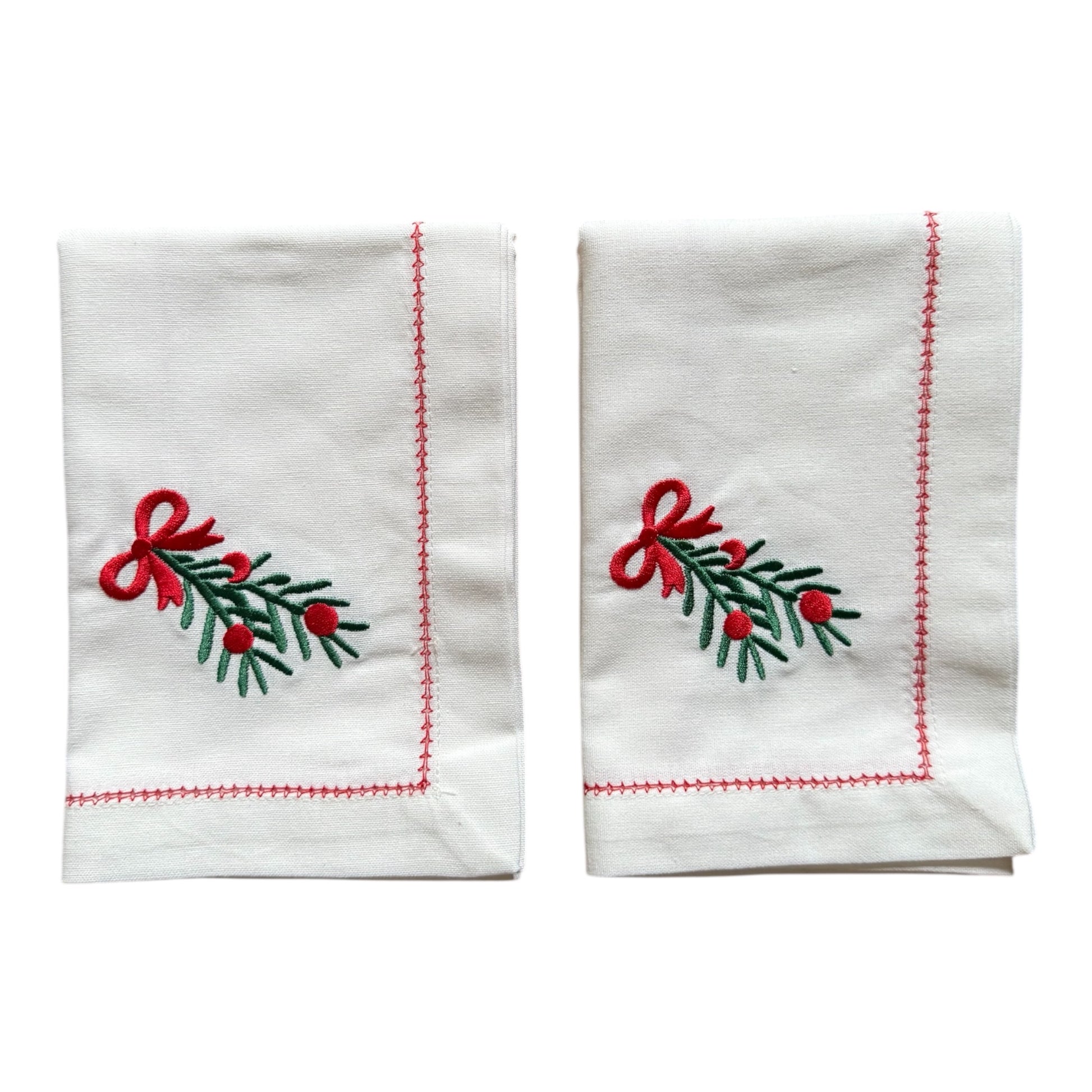 Een wit katoenen servet met een verfijnd geborduurde dennentak met rode strik en een rode stiknaad is een perfecte keuze voor een feestelijke en vrolijke tafelsetting.